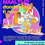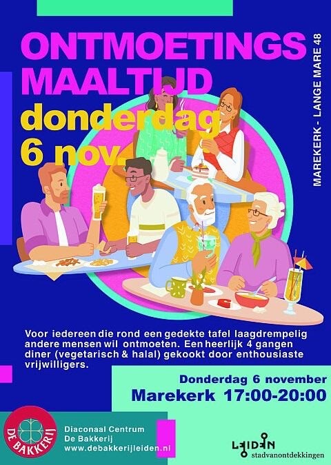 Op deze donderdag wordt in de Marekerk aan de Lange Mare een heerlijke maaltijd bereid door enthousiaste vrijwilligers. Het is voor iedereen die rond een gedekte tafel laagdrempelig andere mensen wil ontmoeten. Om 17 uur begint het 4 gangen diner (vegetarisch en halal) en het is uiterlijk om 20 uur afgelopen. Tussen de gangen zijn er sprekers en zangers. Iedereen is welkom!
